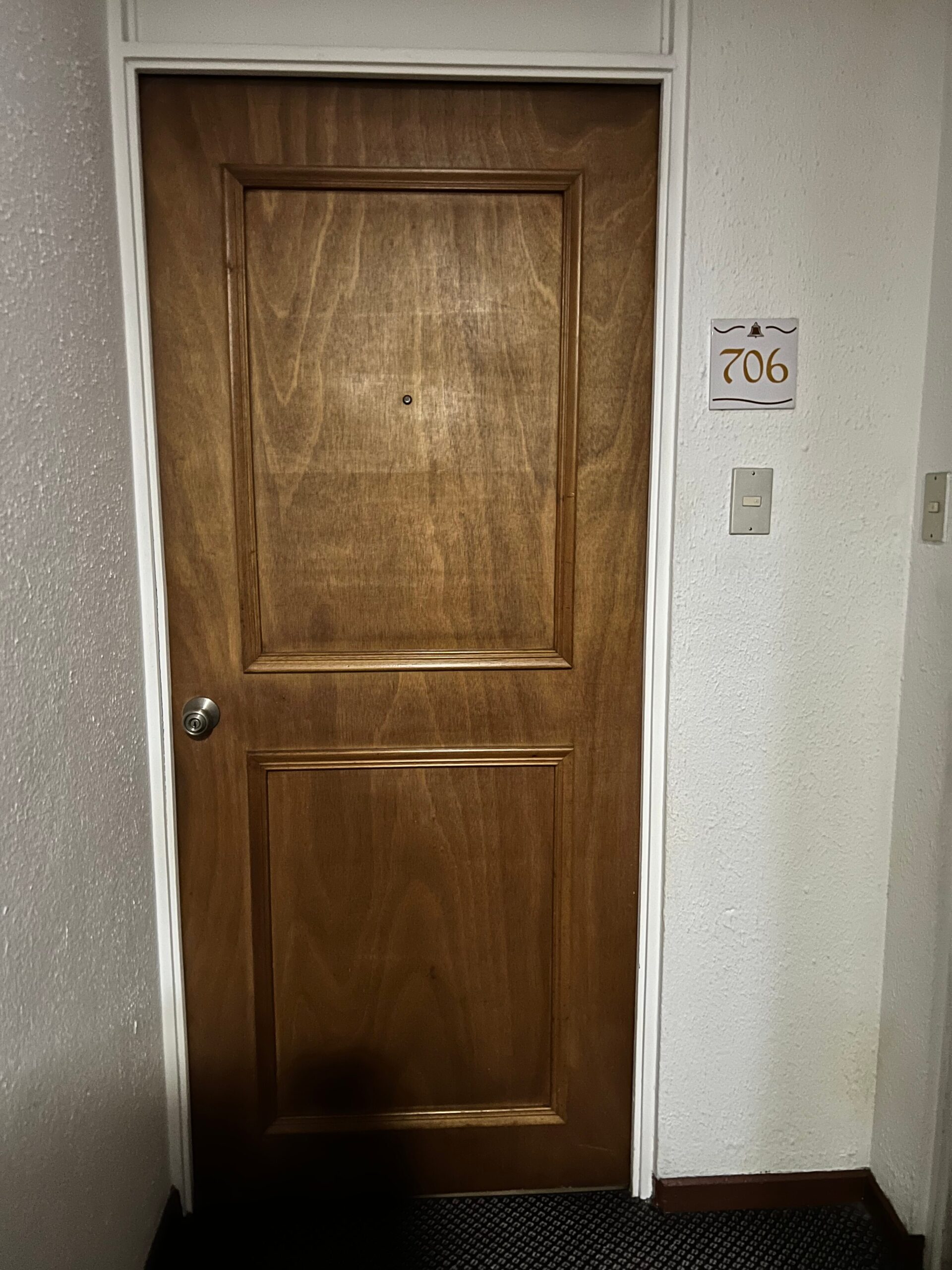 いつも私が指定してる最上階バルコニー付きの部屋、入り口は以前と同じ。
