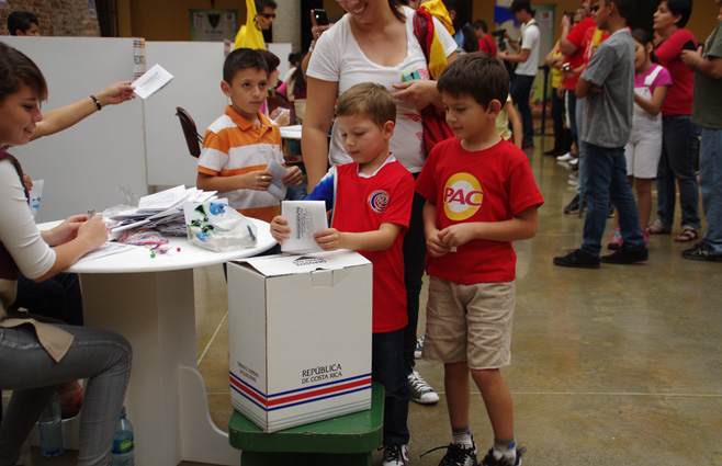 子どもたちにないのは「選挙権」だけで、それ以外の政治的権利は「投票する権利」まで含めてすべて行使できます。政党の集会はもちろん、投票日の投票所でも受付事務を手伝うなど、子どもたちはあちこちで大活躍。コスタリカの選挙は、子どもたち抜きには語れないほどです。