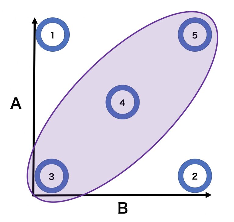 • ⑤は、A、Bともにもともと目標としていたのと同程度の満足度を得られる超越的な点=「トランセンド・ポイント」を表します。